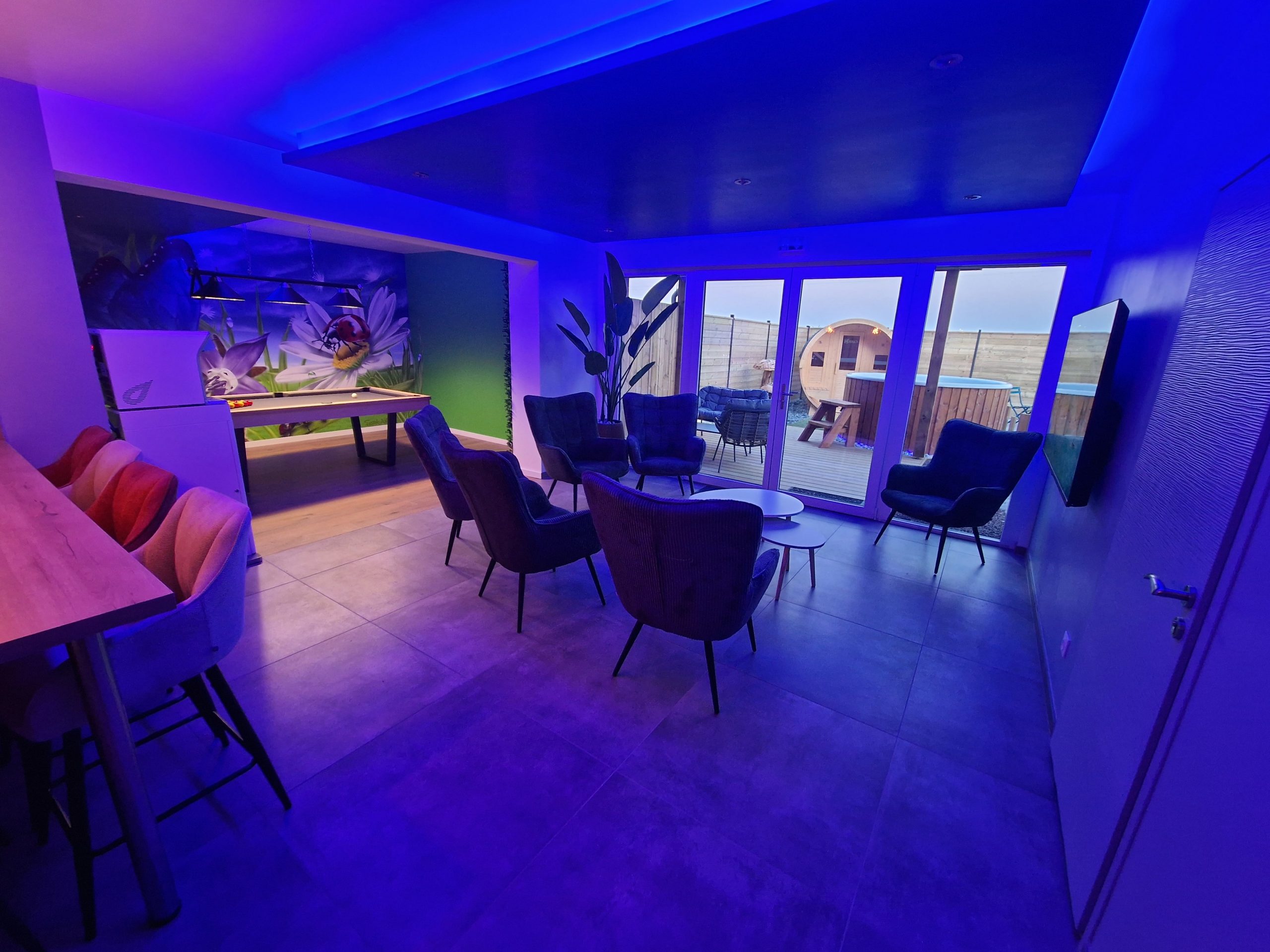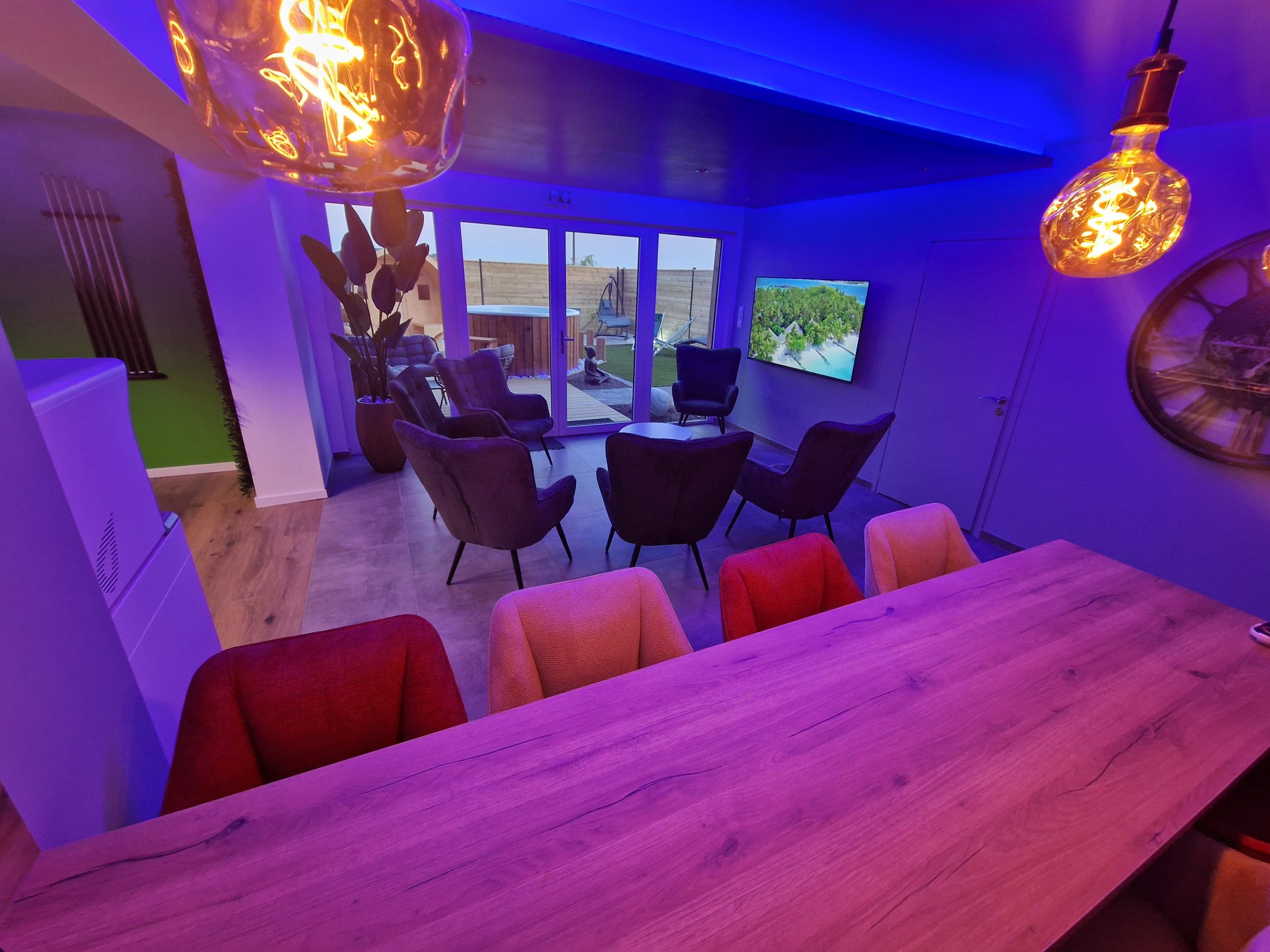 Salon séjour – TV grand écran – Borne d’arcade – Jeu de fléchettes – Billard- siège massant – Chambre (uniquement pour les nuits) – Lit rond (220cm)- Tantra – Bain nordique (en extérieur, effet bubble jet, système de filtration et traitement de l’eau) – Sauna (en extérieur) – Cuisine moderne équipée – Salle de bain spacieuse – Douche – Adoucisseur d’eau – Double vasque – Wifi gratuit – Climatisation – Peignoir et chaussons fournis – Thé, café et fontaine à eau filtrée à disposition – Ménage inclus – Parking Sécurisé – Petit-déjeuner compris